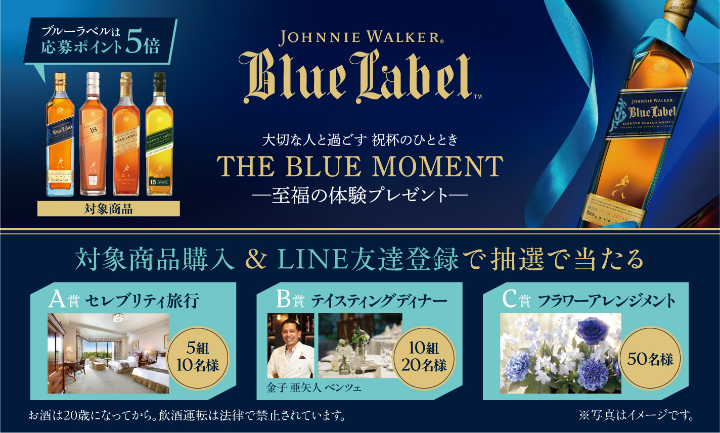 対象期間中に「ジョニーウォーカー ブルーラベル」を含む対象商品を購入のうえ、LINE公式アカウントをお友達登録・購入レシートを登録してご応募していただいた方を対象に、大切な人との“特別な時間”を演出する体験型ギフトを抽選でプレゼントします。