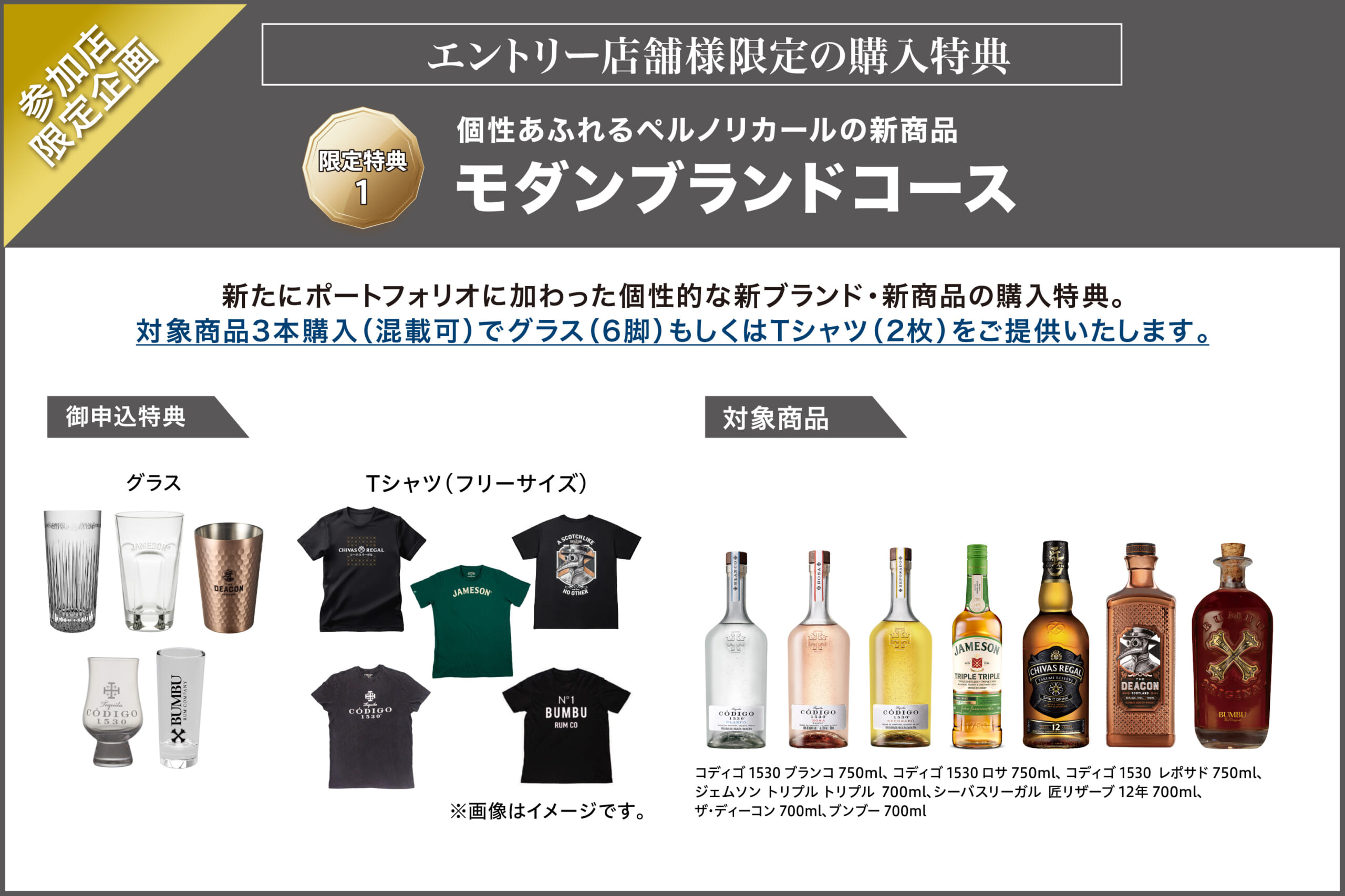 新たにポートフォリオに加わった個性的な新ブランド・新商品の購入特典です。対象商品3本購入でグラス(6脚)もしくはTシャツ(2枚)をご提供いたします。