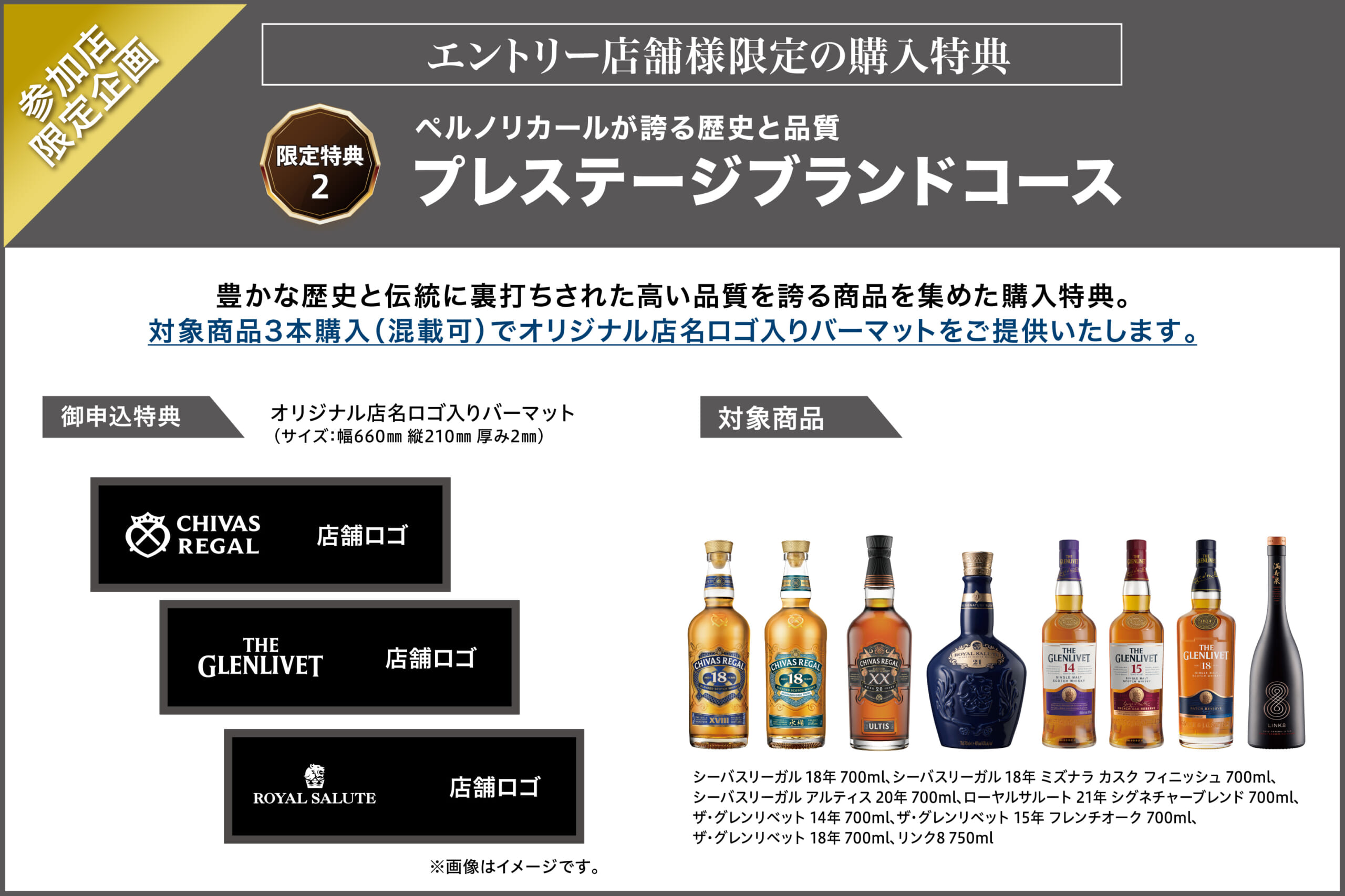 豊かな歴史と伝統に裏打ちされた高い品質を誇る商品を集めた購入特典です。対象商品3本購入でオリジナル店名ロゴ入りバーマットをご提供いたします。