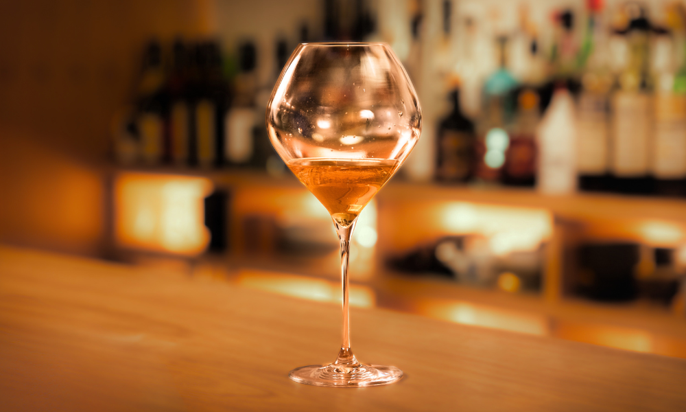 宮之上さん考案のカクテル「Re:Present」。たっぷりしたワイングラスに注ぐことで、見た目からして優雅さが漂う。芳醇なアロマと複層的な味わいのレイヤーをゆっくり愉しめる。